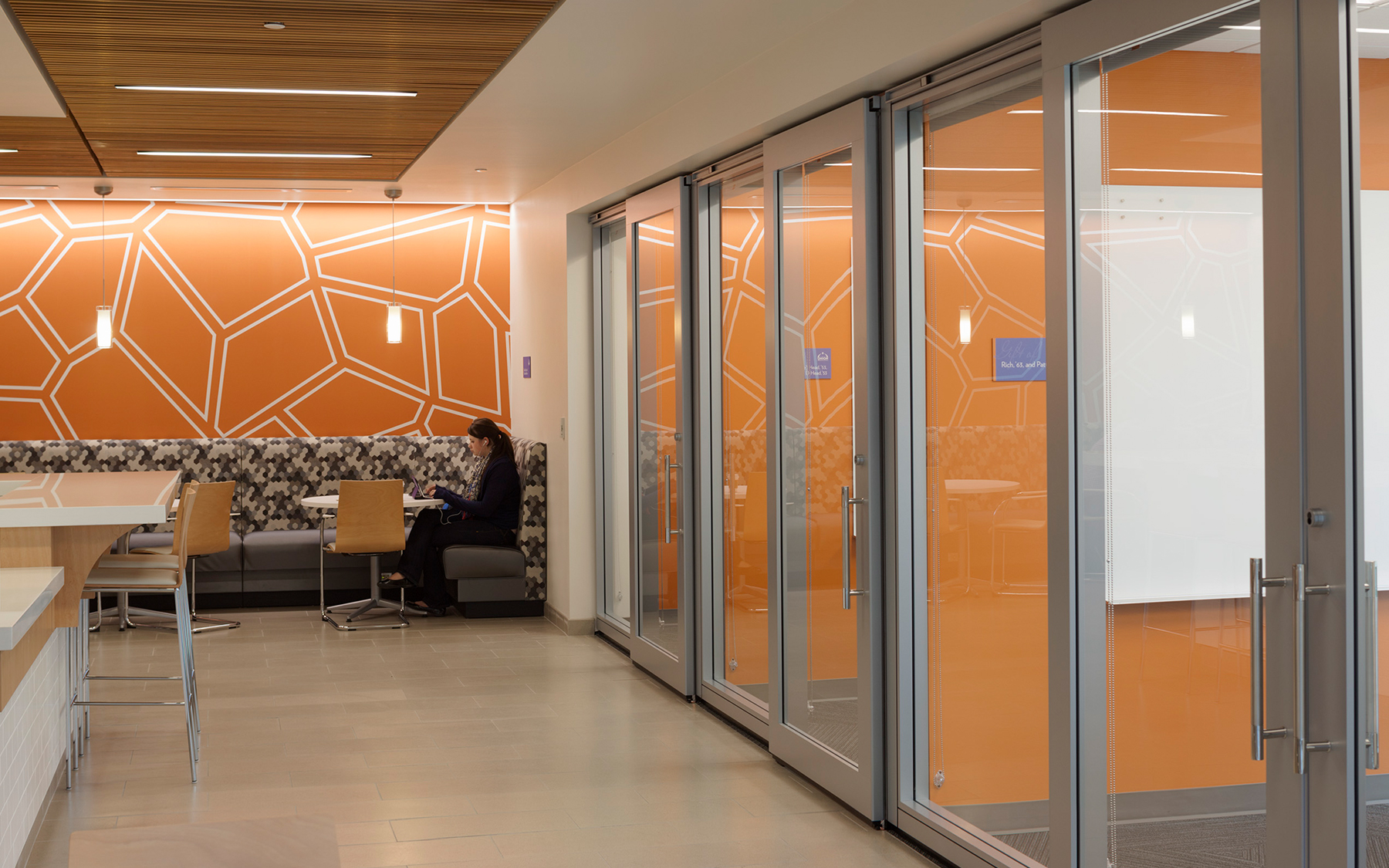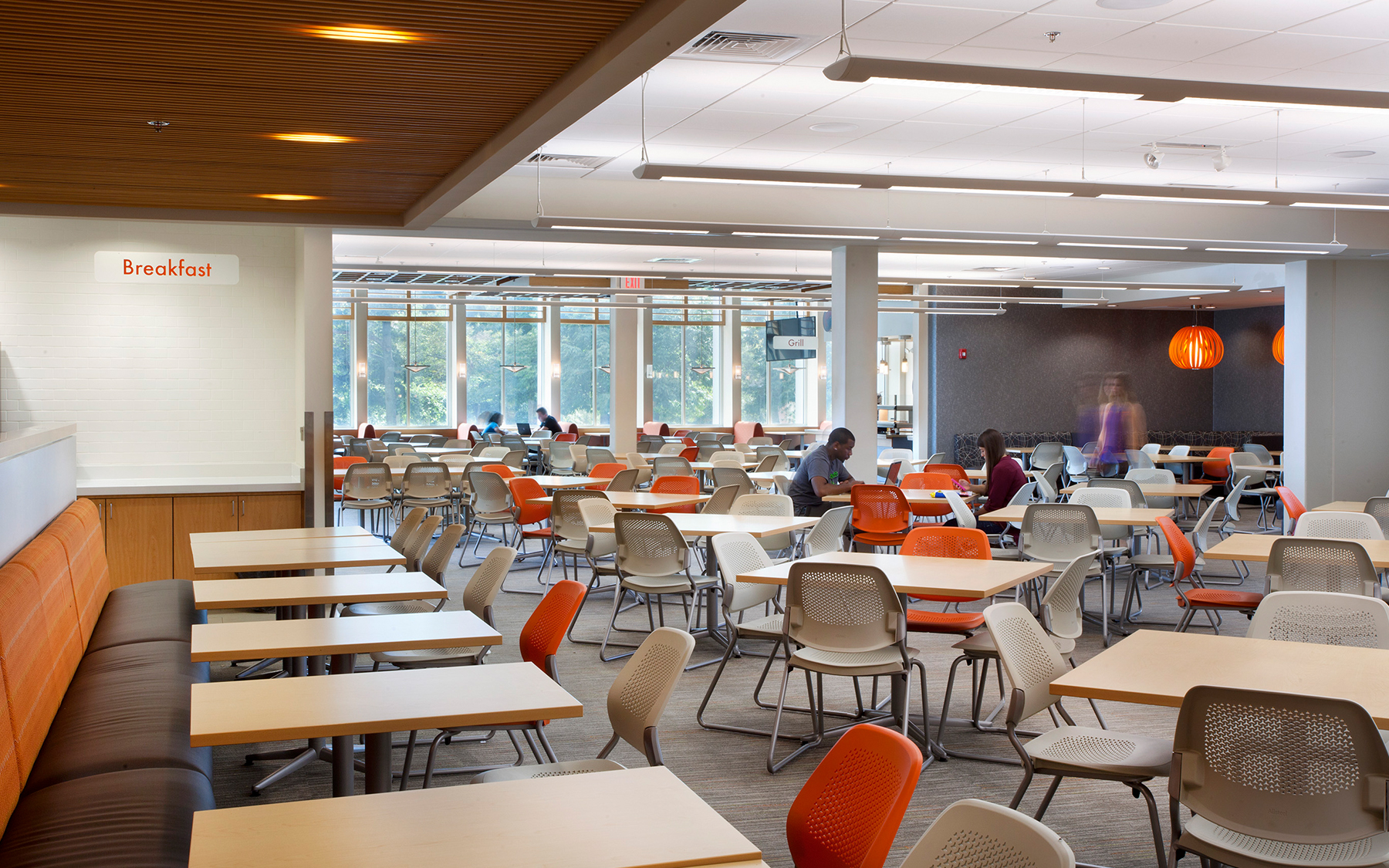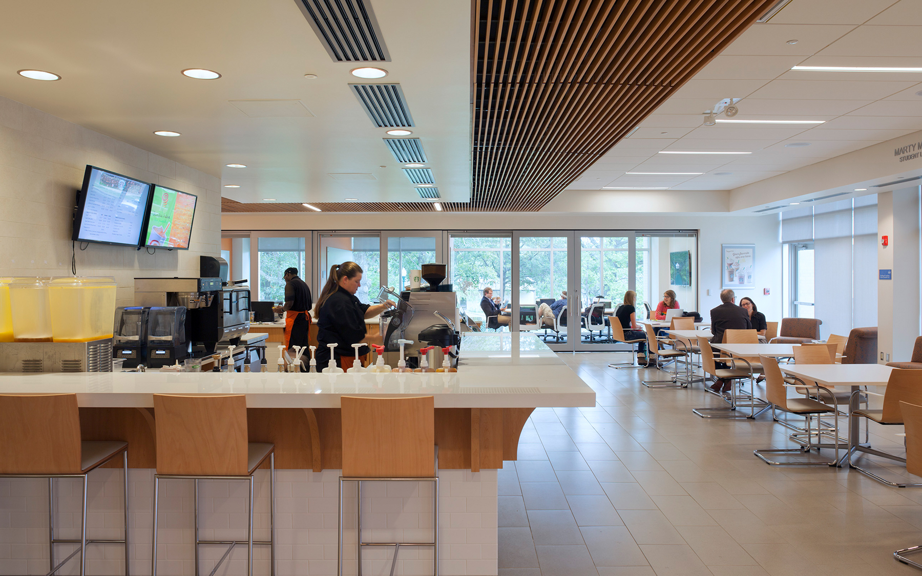 In this Baldwin City, Kansas renovation, TESSERE converted the cafeteria line into six unique platforms, including a number of fresh and cooked-to-order options. Daylighting was used in the 330-seat center to take advantage of courtyard views, and a glass partition was installed to allow the grill to remain operational and accommodate students’ late-night schedules.